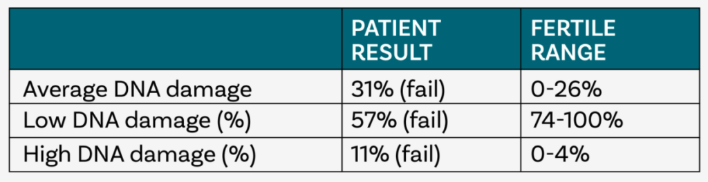 除了以上提到的精液分析,Y染色体微缺失,还有一个检查叫精子DNA碎片化检测(sperm DNA fragment test)。这个测试会给一个叫DNA碎片化指数(DNA Fragment Index, DFI),DFI越高,碎片化程度越高,囊胚发育越不好。形态正常的精子也可能DNA碎片化程度高。以下表格列出了DNA碎片化检测结果。病人的31%的精子有中等程度DNA损伤,57%的精子有低度损伤,11%有高度损伤。没有达到最后一列标准值。这里DFI的标准是中高DNA损伤的精子不得超过26%。不同的公司可能给出的正常范围有略微差异,20-30%不等。客人也做过这种测试,DFI是21.7%,给了两个参考标准:捐精的精子是15%,正常的标准是小于27%。
